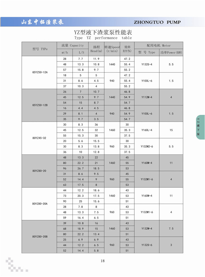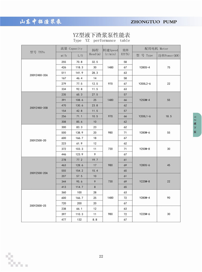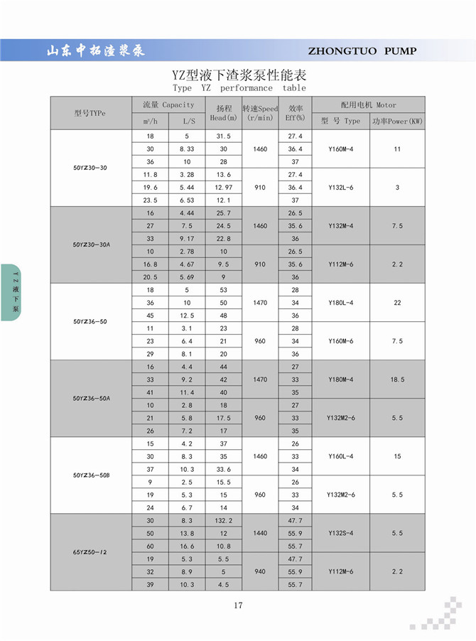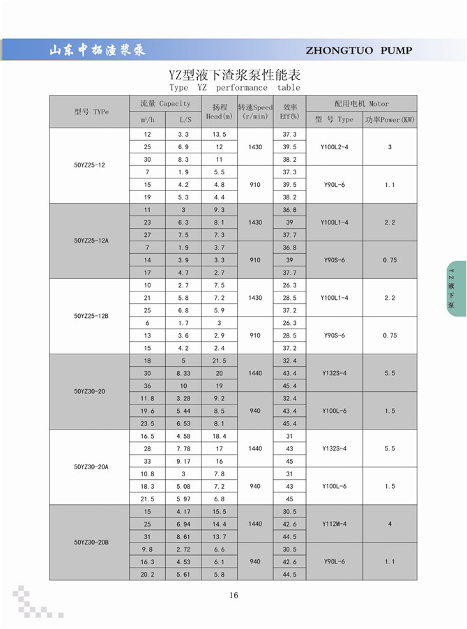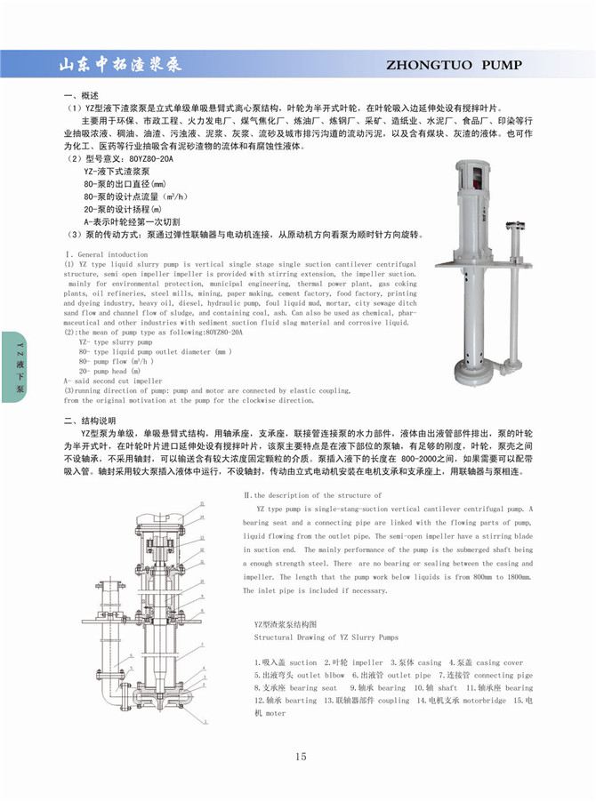 三、結構(gòu)說明 YS-YZS型(xing)泵為單(dān)級,單吸(xī)懸臂式(shi)結構,用(yong)軸承座(zuo),支承座(zuo),聯接㊙️管(guan)連接♌泵(beng)的水力(lì)部件,液(yè)體由出(chū)液管部(bu)件排出(chu),泵的葉(yè)輪為半(bàn)開式葉(ye)輪,在葉(yè)輪葉片(piàn)進口延(yan)伸處設(she)有攪☁️拌(ban)葉片,該(gai)泵主🛀要(yào)特點是(shì)在液下(xià)部位的(de)泵軸,有(you)足夠的(de)剛度,葉(yè)💋輪,泵殼(ke)之間不(bu)設軸承(cheng),不采用(yòng)👅軸封,可(kě)以輸✉️送(song)含有較(jiao)大濃度(du)固體顆(ke)粒的介(jie)質。泵插(cha)入液下(xià)的長度(dù)在600—3000之間(jiān),如果需(xu)要可以(yǐ)配帶吸(xi)入管。